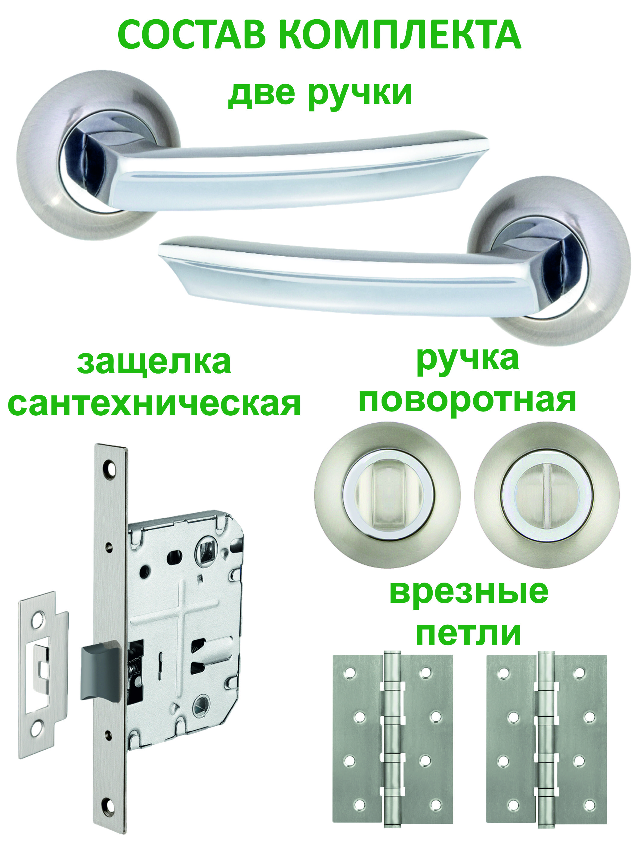 Ручка дверная - пара, защелка сантехническая, ручка поворотная - компл., петли универсальные - пара