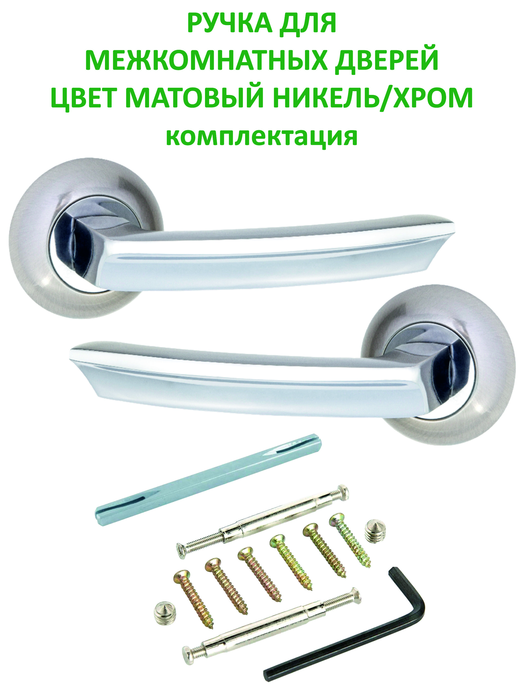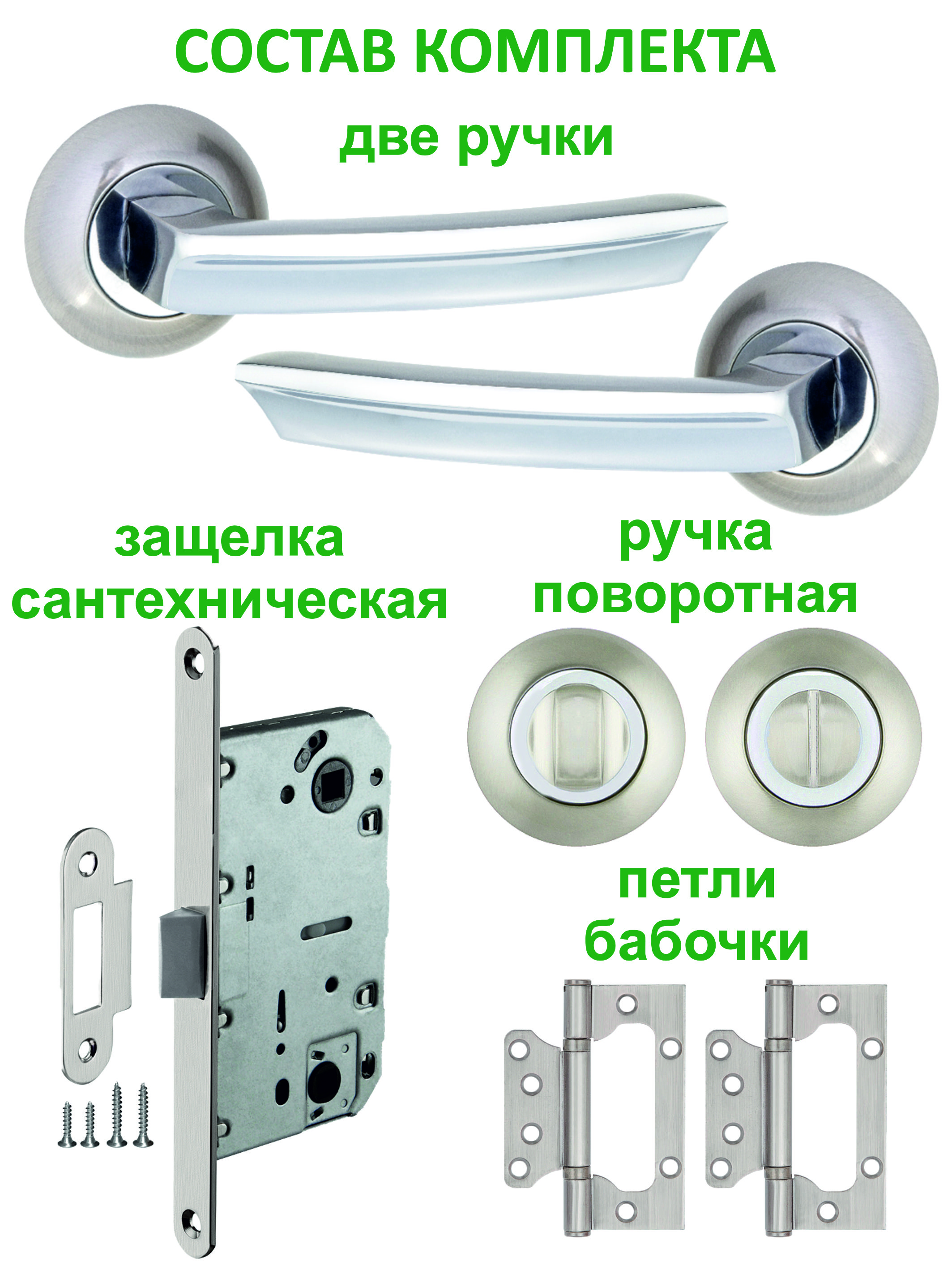 Ручка межкомнатная - 2 шт, Защелка - 1 шт, Ручка поворотная - 1 компл, Петли бабочка - 2 шт.