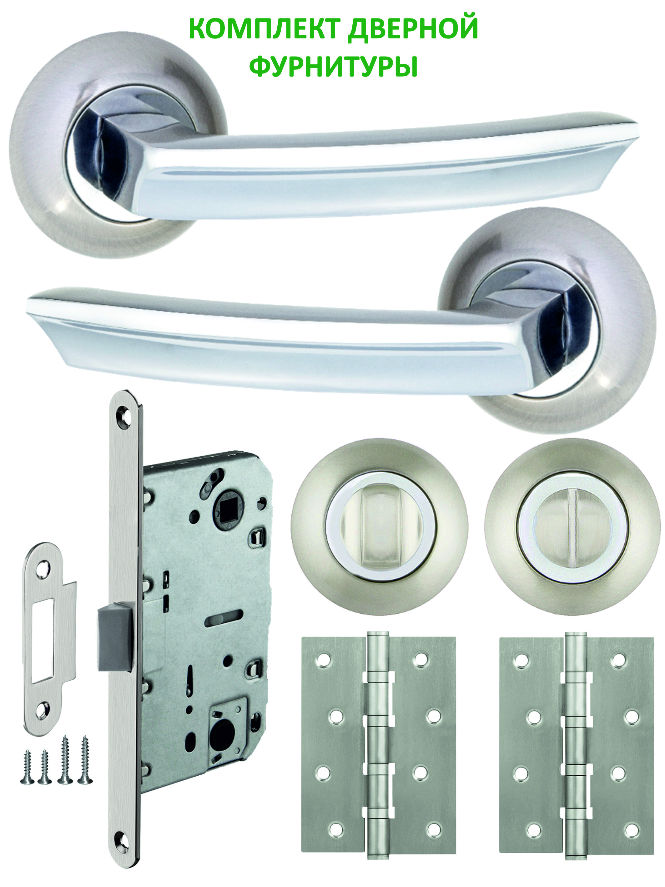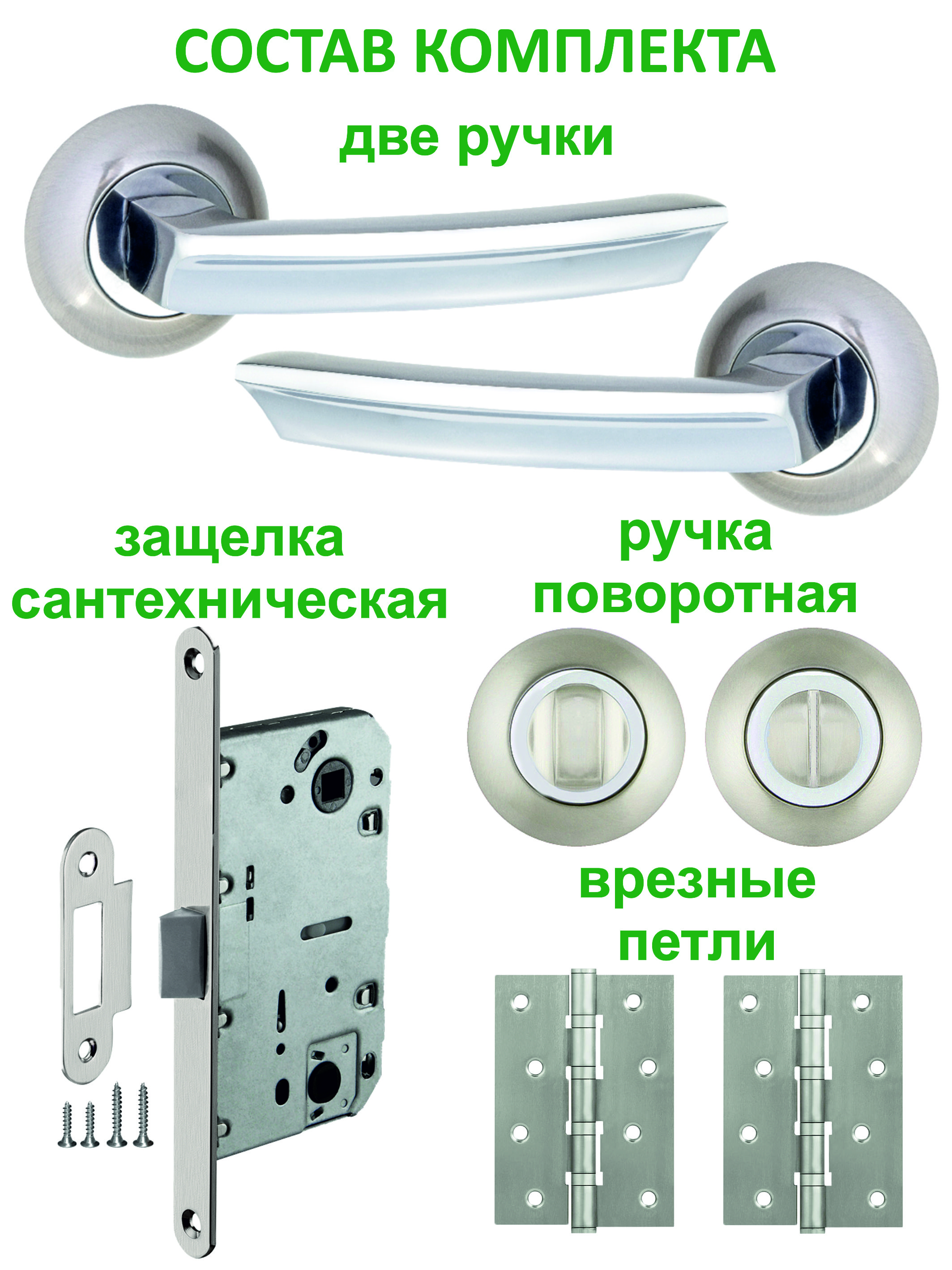 Ручка дверная - пара, защелка сантехническая, ручка поворотная - компл., петли универсальные - пара